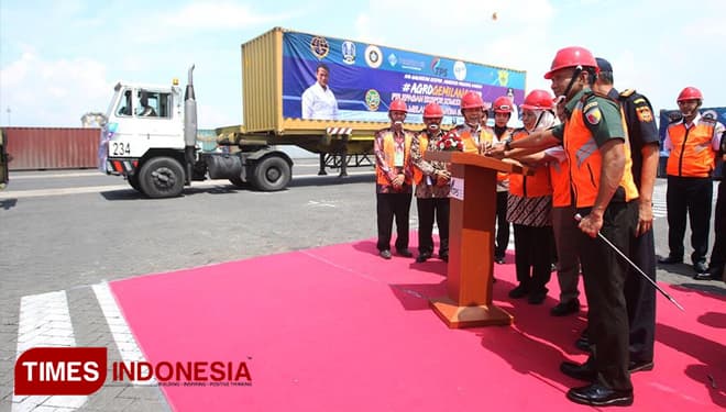 Gubernur Jawa Timur. Dra. Hj. Khofifah Indar Parawansa saat melepas ekspor komoditi pertanian di Terminal PetikEmas Surabaya (TPS). Kamis (21/3/2019). (FOTO: TIM Media For TIMES Indonesia)